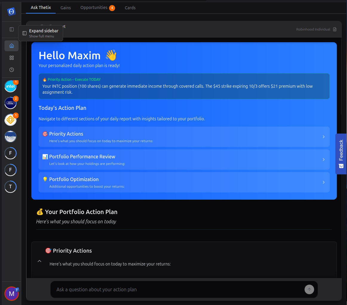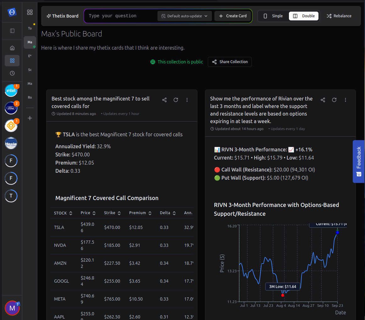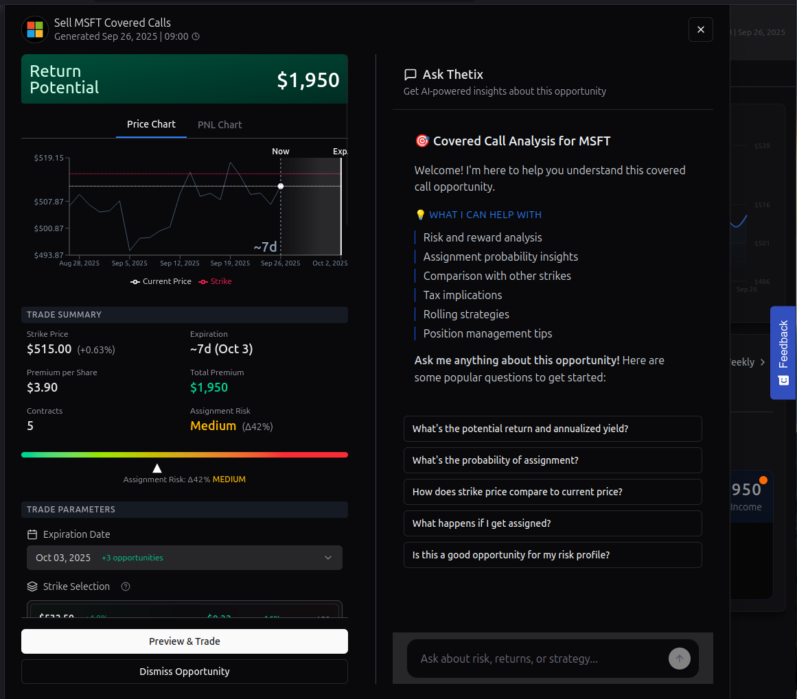 Beyond answering questions, Thetix helps you build sophisticated, personalized dashboards that display exactly the information you need. Track assignment probabilities, compare strikes across multiple positions, monitor tax implications, or analyze rolling strategies, all in a visual format that makes complex data instantly understandable.